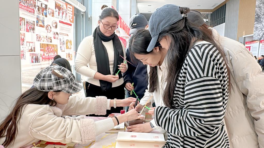本次展览作品题材丰富、风格多样,涵盖了秦汉古印复刻、现代创意篆刻、生肖主题印章等多个类别。每一方印章都凝聚着创作者的匠心,篆文线条或刚劲有力、或婉转流畅,章法布局疏密有致,朱白对比相映成趣,既展现了传统篆刻艺术的古典韵味,又融入了当代青年的创新思考。展览现场,文萃印社成员化身志愿讲解员,向观展师生详细介绍每件作品的创作灵感、篆体演变及雕刻技法,生动解读 “方寸石上刻春秋”的艺术内涵。不少同学在作品前驻足良久,认真记录篆刻章法与用字技巧,现场交流氛围十分热烈。