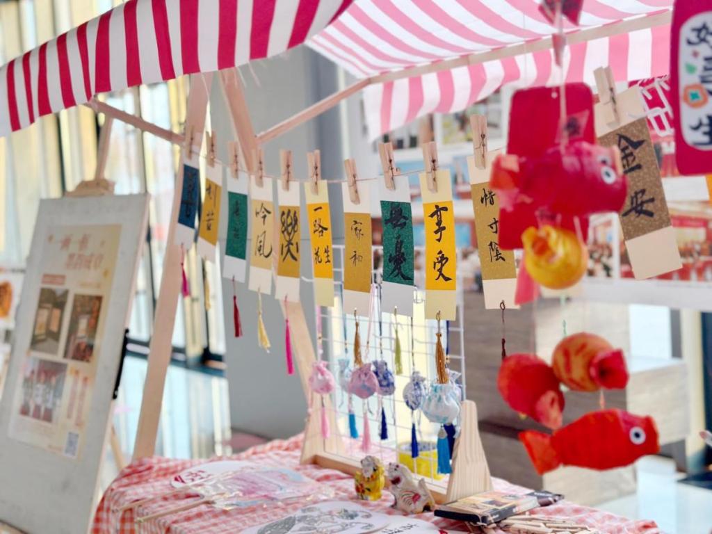 集市现场,十余个创意摊位依次排开,“榴韵丹青”主题摊位,社团成员们以枣庄特产石榴为创作灵感,推出了系列特色文创。既展现地域特色,又充满现代设计美感。这些作品将书画的笔墨趣味与石榴的多子多福寓意完美结合,成为现场最受欢迎的创意产品。“字里行间”展板区,图文并茂地介绍“福”“寿”等吉祥汉字的不同书体演变,以及书法与文人生活的传统关联,吸引不少同学驻足研读。文创手作体验区中,书签、团扇、帆布包等承载传统书画元素的文创产品吸引众多师生驻足挑选,大家还能亲手参与拓印、手绘等体验项目;艺术互动创作区里,专业师生现场挥毫创作、定制作品,与参观者交流创作心得,墨香与欢笑声交织,尽显校园艺术活力。