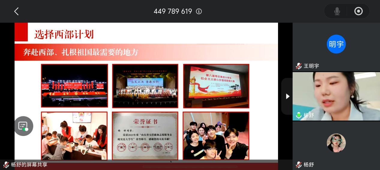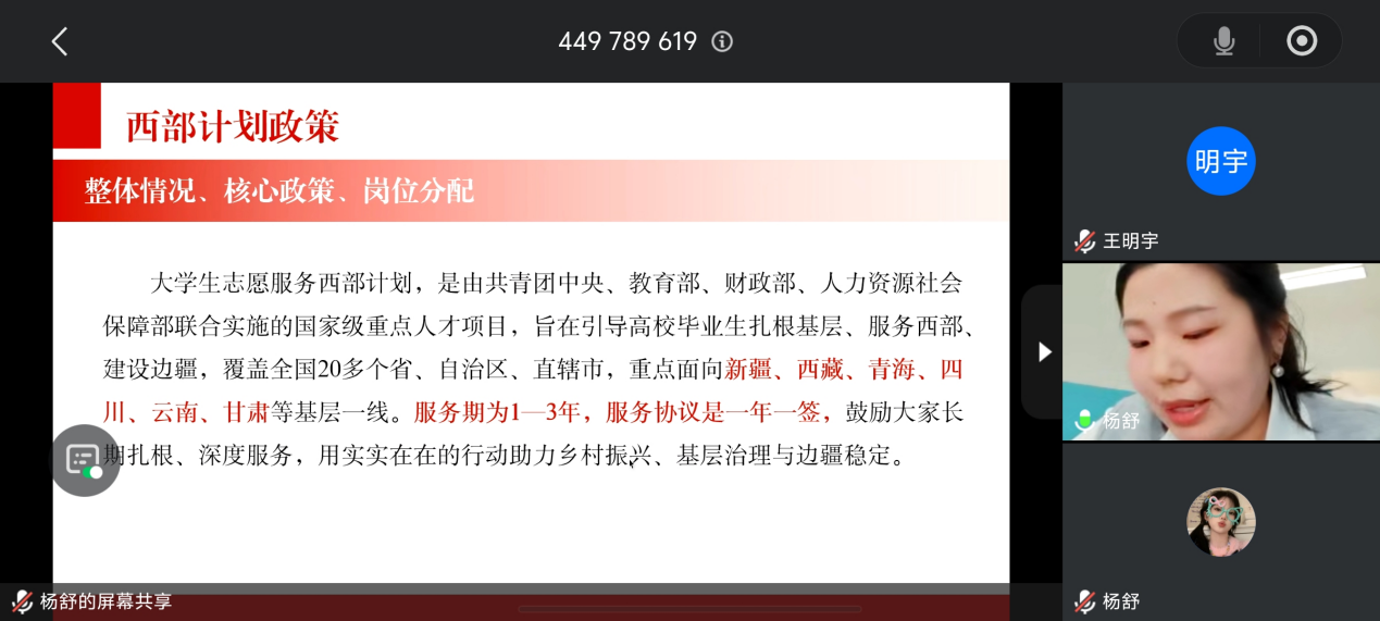 此次宣讲会线上线下同时进行,邀请美术与艺术设计学院优秀毕业生杨舒为在校同学们进行宣讲。宣讲会上她结合亲身志愿服务经历分享感悟,系统介绍了西部计划项目概况,细致解读了相关政策与岗位分类,详细讲解了报名的流程方法、选拔流程及时间节点等。重点讲解了西部计划相关待遇保障与期满考研、考公、就业等优惠政策。同时,进行了现场的互动交流和问答,她耐心回应同学们提出的问题。最后,西部计划工作负责老师对宣讲进行总结,鼓励毕业生胸怀家国、扎根基层,将专业所长与社会需求相结合,以实际行动投身西部建设,在服务奉献中实现青春价值。