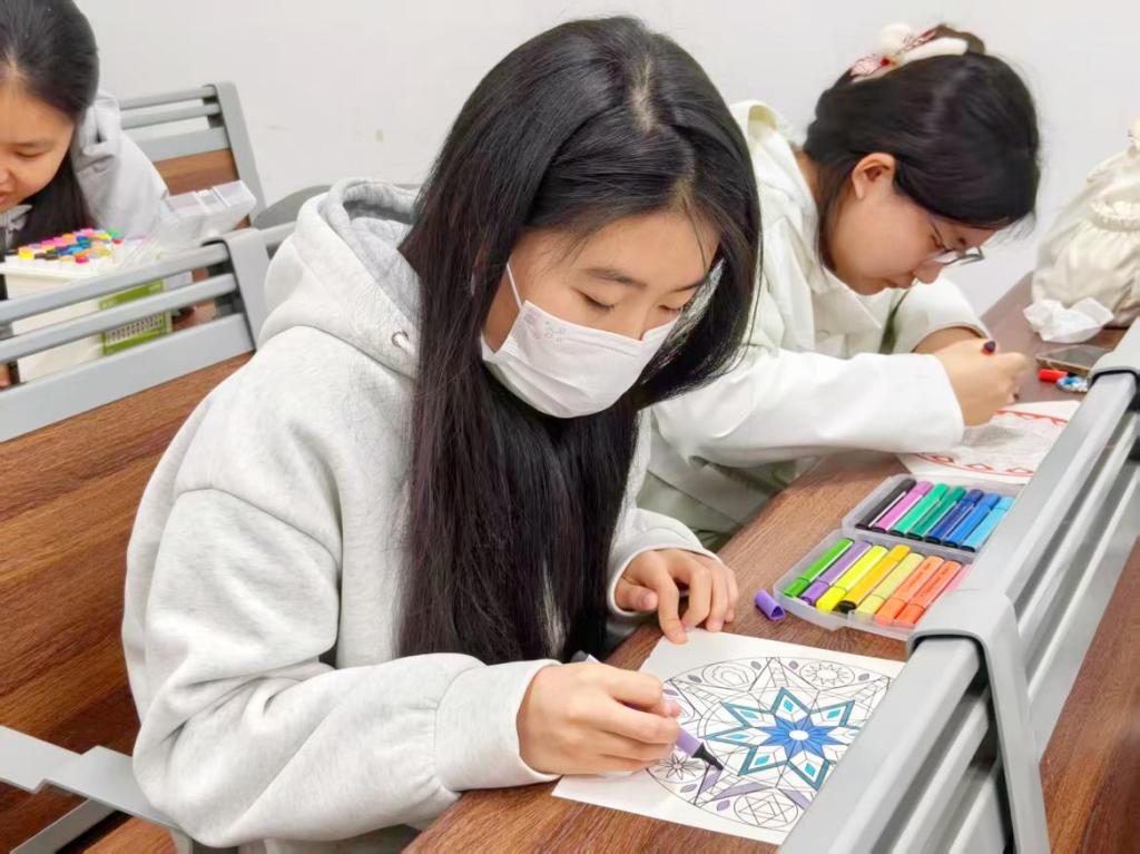活动以曼陀罗绘画为媒介,将心理学原理与艺术创作深度融合,吸引了全校众多学生参与。活动现场,主持人先带领大家走进曼陀罗的世界,讲解其背后的心理学内涵与疗愈逻辑,引导同学们理解色彩、图形与情绪表达的关联,也为后续创作打开思路。