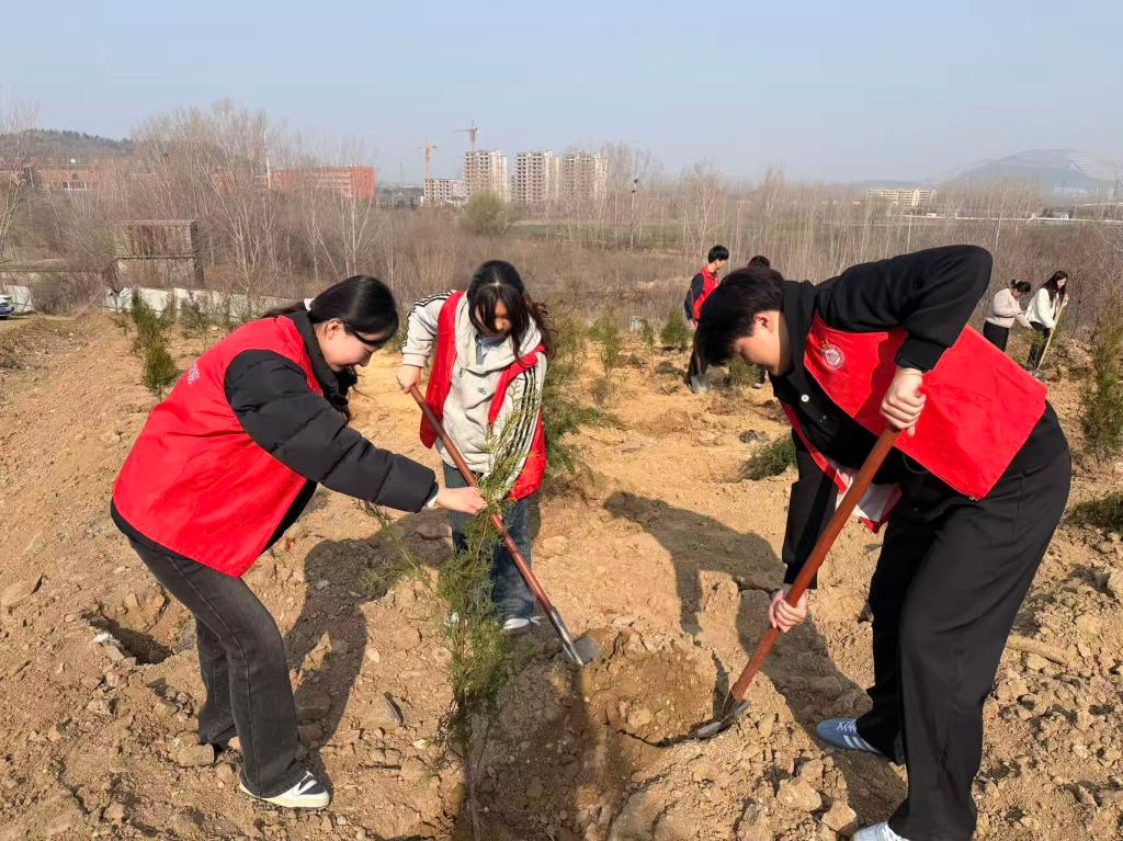 活动现场春意盎然,师生党员们热情高涨、分工协作、有序配合,手持铁锹、锄头,严格按照植树规范认真完成每一道工序。师生党员们俯身挥锹挖坑、细心扶苗定根、仔细培土压实,再提桶引水、浇灌新苗,劳动的身影在阳光下格外坚定。师生党员们以实际行动践行绿色发展理念,在劳动中锤炼党性修养、强化责任意识,让党徽在实干中熠熠生辉。